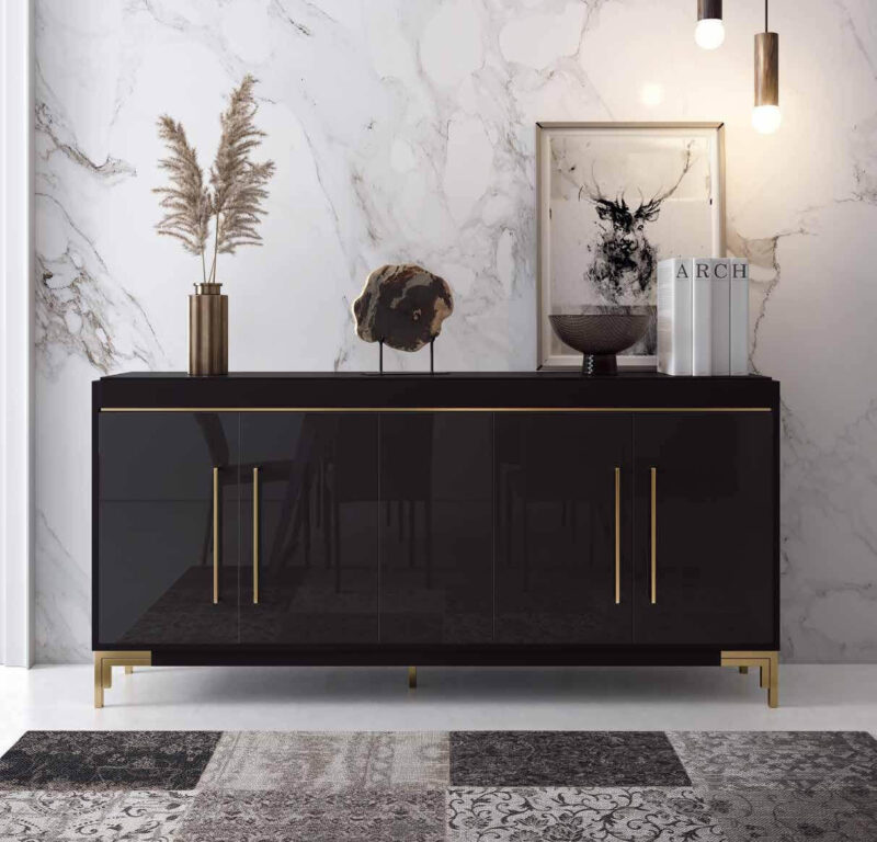 Aparadores de calidad con puertas en alto brillo y elementos dorados, formas diferentes para poder aportar creatividad a los modelos. Los conjuntos ofrecen la posibilidad de combinarse con espejos o cualquier elemento decorativo.