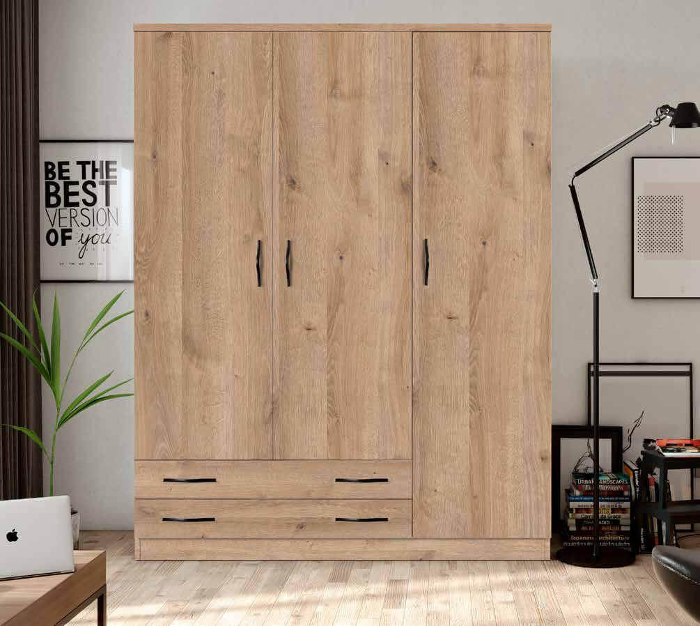 Armario tres puertas con dos cajones con gran espacio de almacenamiento para tener tu ropa organizada. Incluye dos barras de colgar (una en cada lado) y dos baldas (una en cada puerta).
