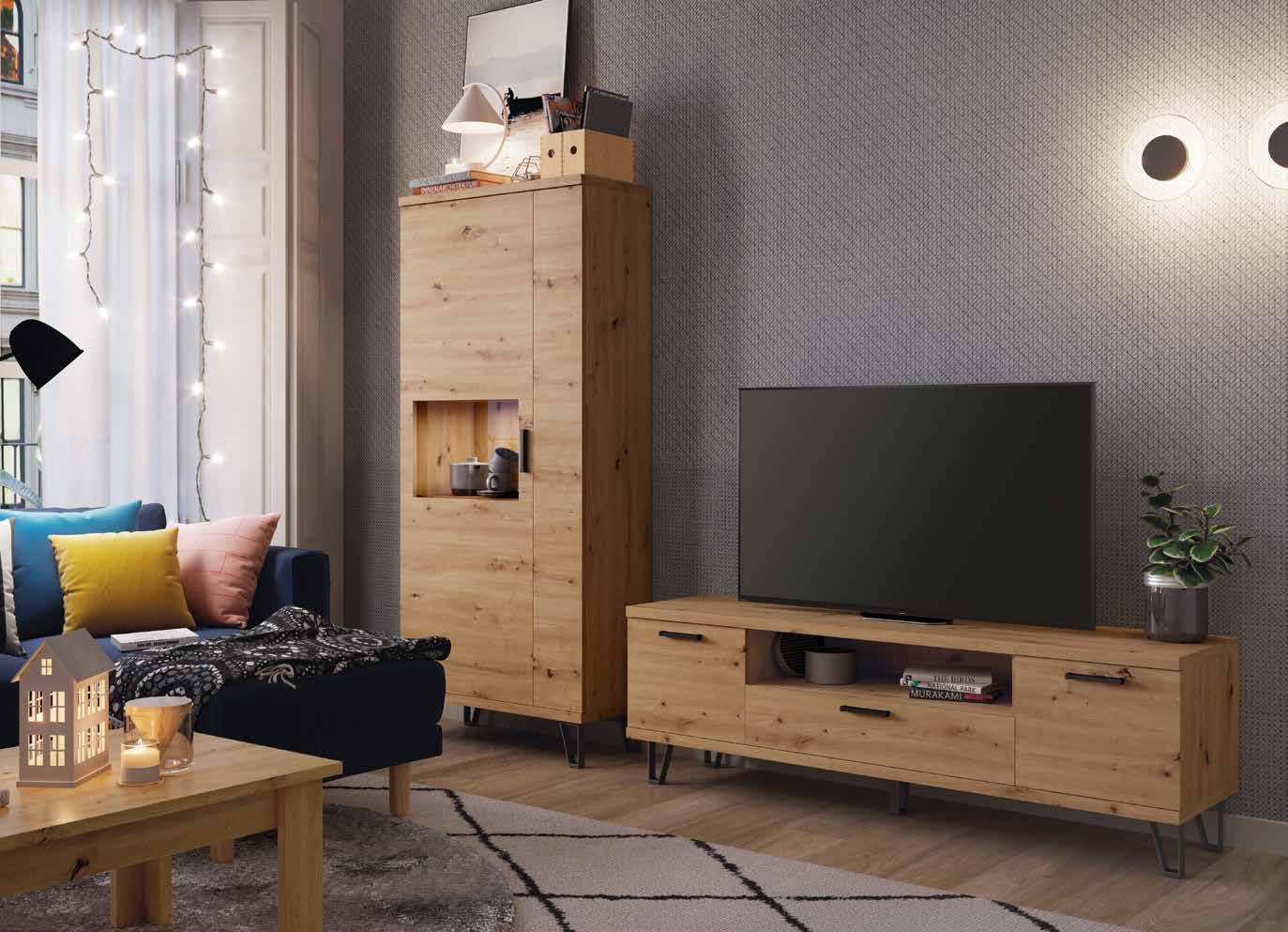 Dale un toque moderno y elegante a tu salón con este bajo de televisión en color Artistan, un diseño sofisticado y funcional que combina a la perfección con cualquier estilo de decoración. Sus tiradores lineales negros aportan un contraste sutil y elegante, mientras que sus patas incluidas elevan la estructura para un acabado más ligero y estilizado.