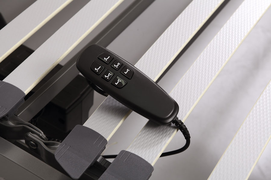 - 5 planos articulados por motor doble con mando por cable, siendo fijo el plano lumbar, que a su vez incorpora doble lama y cursores para la regulación de firmeza.