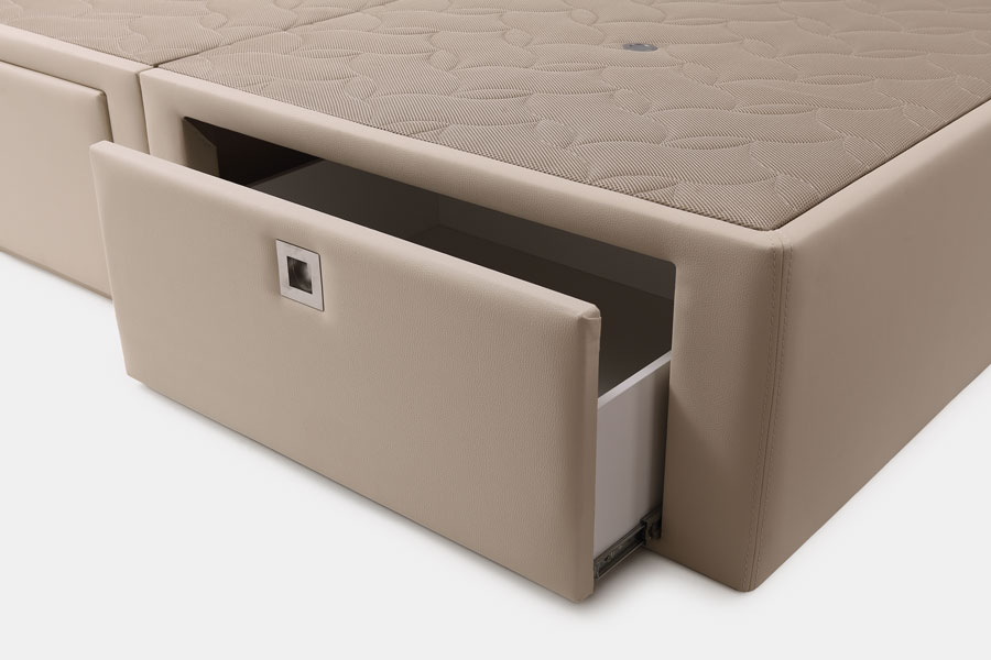Canapé tapizado Cloe con 2 cajones laterales en cada lado para facilitarte el orden y colocación en tu dormitorio. Descubre el verdadero sentido de tener un canapé altamente funcional en casa con materiales de primera calidad. Configúralo con opciones que lo ajustan a tu estilo de vida. ¡Este producto tiene un descuento -10% en tienda física, consultar condiciones enseñando esta imagen!.