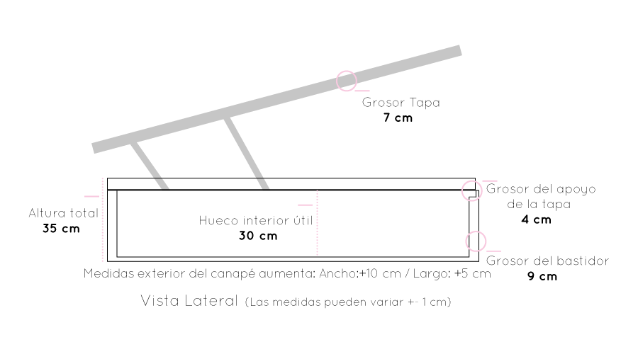serie siempre va con hilo al tono de la polipiel o tela elegida). - Tapa PREMIUM (Tablero de 8mm con 4 barras longitudinales, una barra transversal colocada en la parte superior del anclaje de los bombines y 6 barras de refuerzo perimetral, con 16 huecos de ventilación y 4 válvulas de aireación). Solo disponible en medidas a partir de 135 cm. Patente utilidad nº 201531348. Sujeción de la estructura metálica al tablero de la misma mediante CLAVADO Y PEGADO de un polímero, para evitar los molestos ruidos de la tapa.