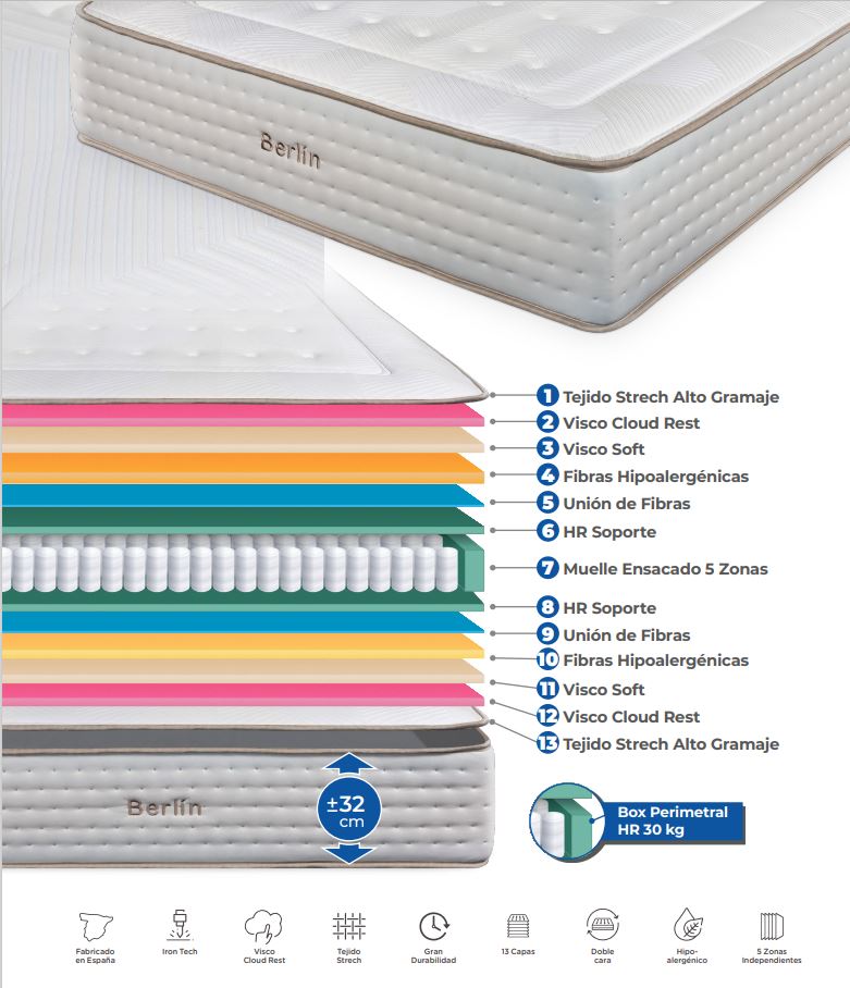 Descansa como mereces con el colchón Berlín, diseñado para ofrecerte el equilibrio perfecto entre confort y firmeza. Con sus 32 cm de altura, este colchón de muelle ensacado cuenta con 13 capas de materiales de alta calidad y doble cara para una mayor durabilidad.