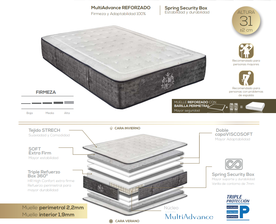 - Perfecto para personas con problemas de espalda o para personas mayores por su muelle multiadvance y su refuerzo spring segurity (varilla de contorno de 7cm para mayor soporte y durabilidad).
