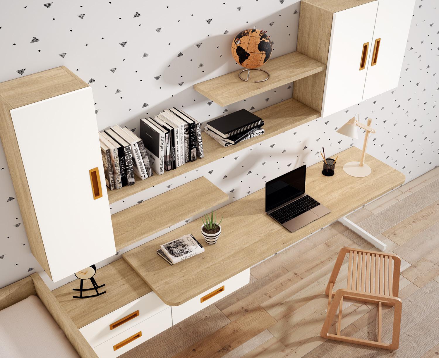 Este bonito dormitorio juvenil completo, en tonos roble combinado con nevado y miel, destaca por su diseño moderno y acogedor, ideal para crear un espacio donde descansar, estudiar y disfrutar. Su mezcla de colores naturales aporta equilibrio, luminosidad y estilo atemporal al dormitorio.
