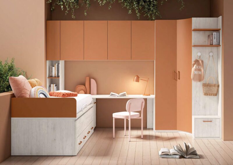 Este moderno y bonito dormitorio juvenil te permite combinar los muebles, colores y acabados como más te guste, creando un espacio funcional, elegante y lleno de personalidad. Ideal para adaptarse a cualquier habitación y acompañar cada etapa de su crecimiento.