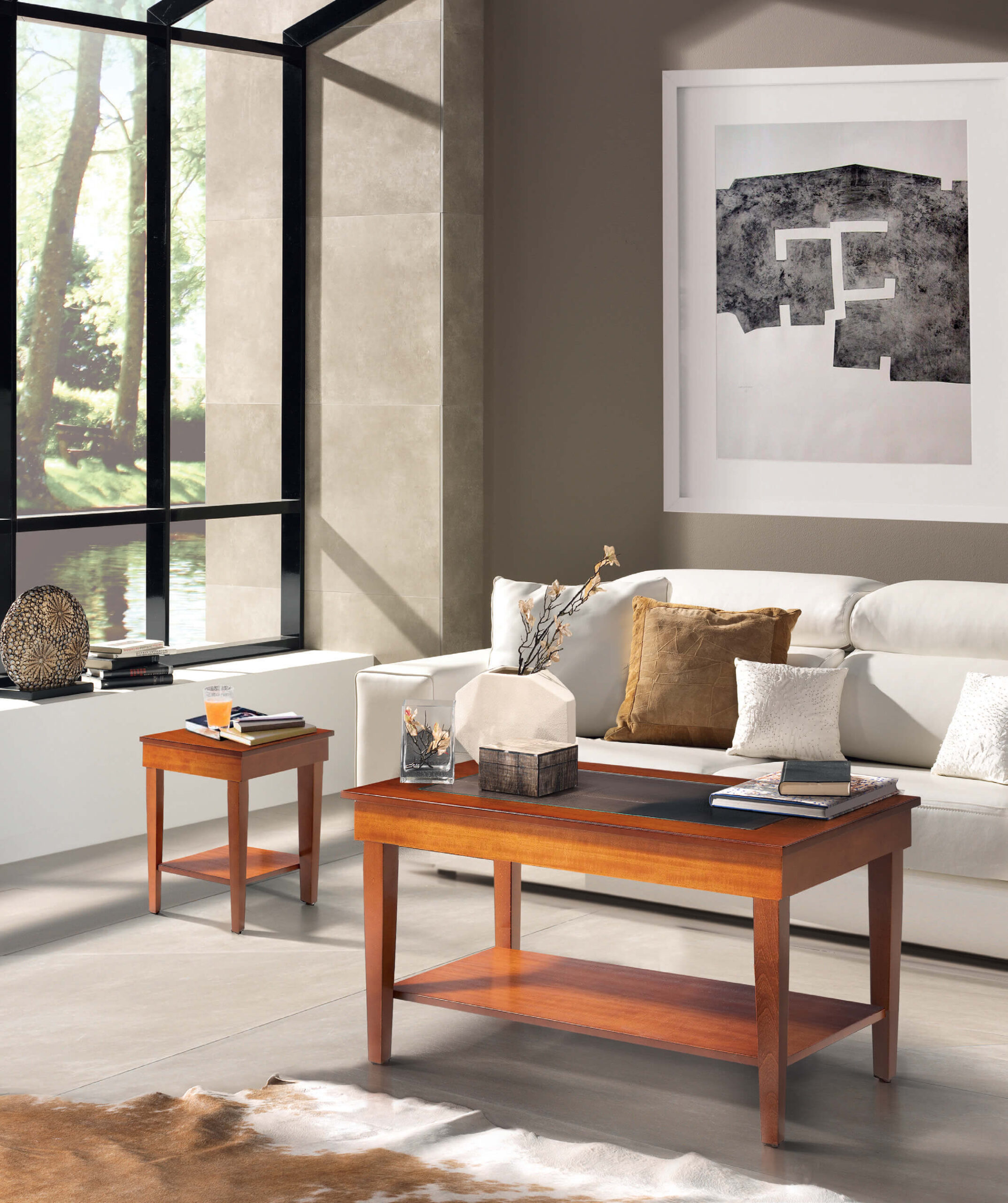 Mesa de centro elevable en color cerezo con cristal blanco.
