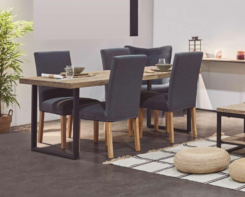 La mesa de comedor extensible Steve es una pieza única que aporta elegancia y funcionalidad a cualquier salón. Con una tapa de madera de roble natural, bordes estilizados, y patas metálicas cruzadas en acabado negro mate, combina un diseño sofisticado con practicidad. Su mecanismo extensible de carro permite adaptarse a cualquier ocasión, siendo ideal para reuniones o cenas familiares.