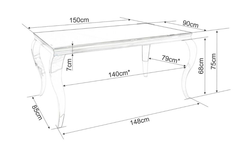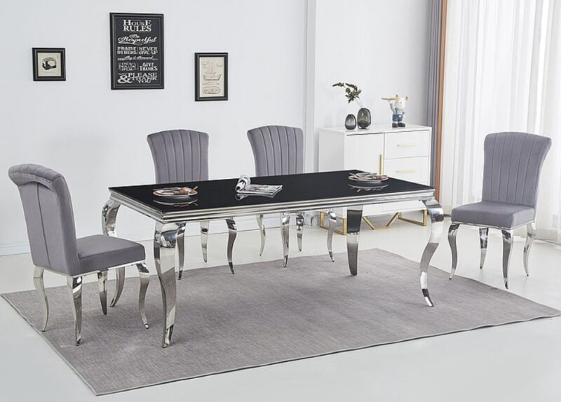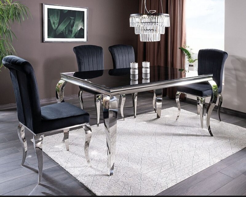 Mesa de comedor de acero inoxidable con la tapa de cerámica en color negro. Una mesa elegante que quedará perfecta en tu salón.