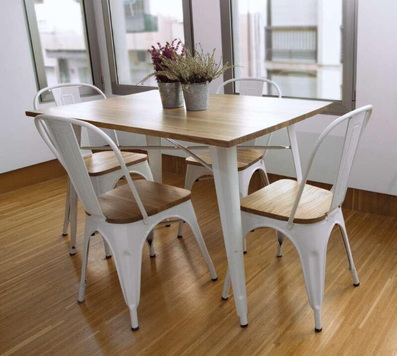 Preciosa mesa de comedor blanco con la tapa en color natural.