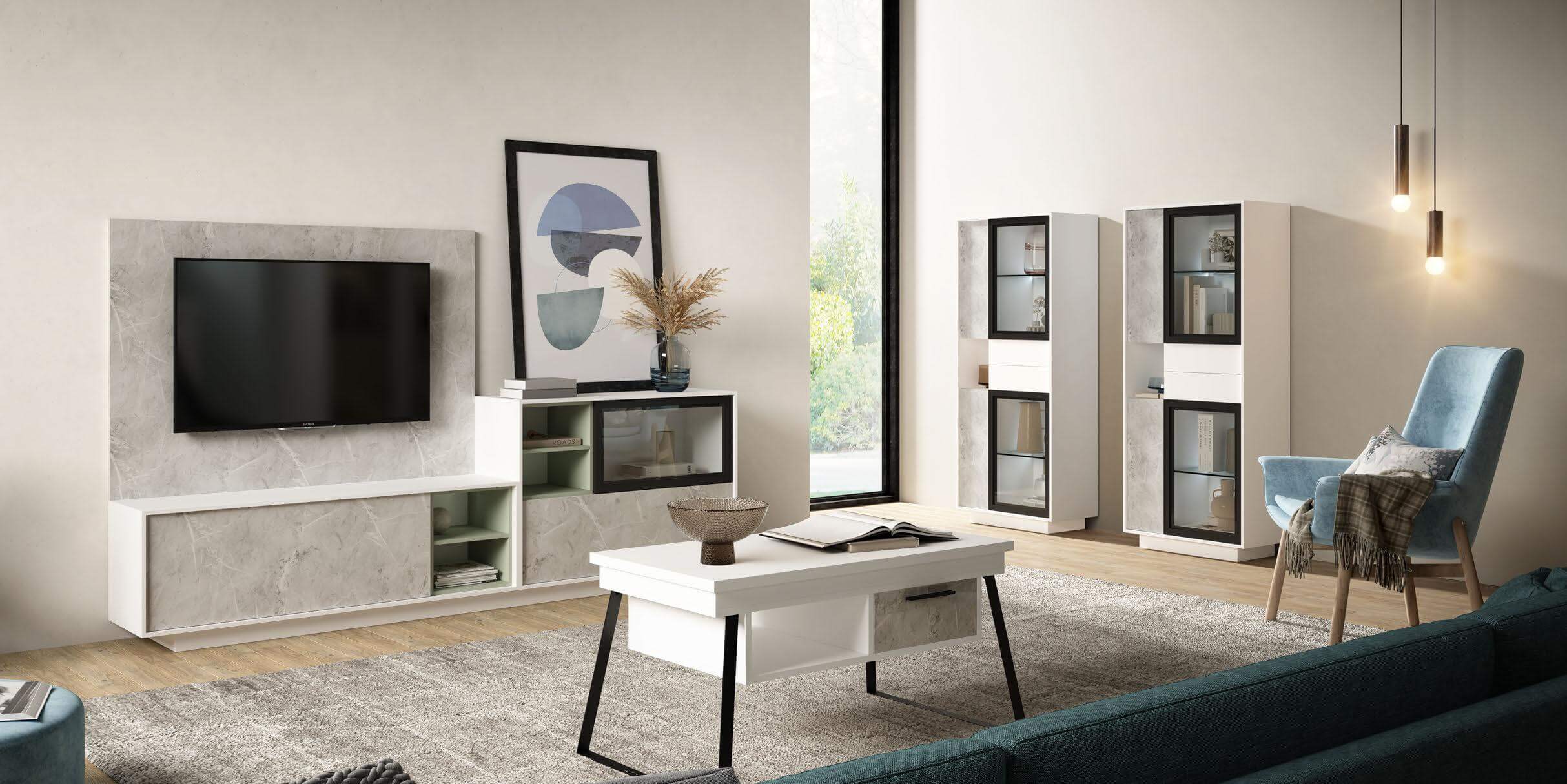 Opciones adicionales (vitrinas y mesa de centro) para personalizar tu salón.