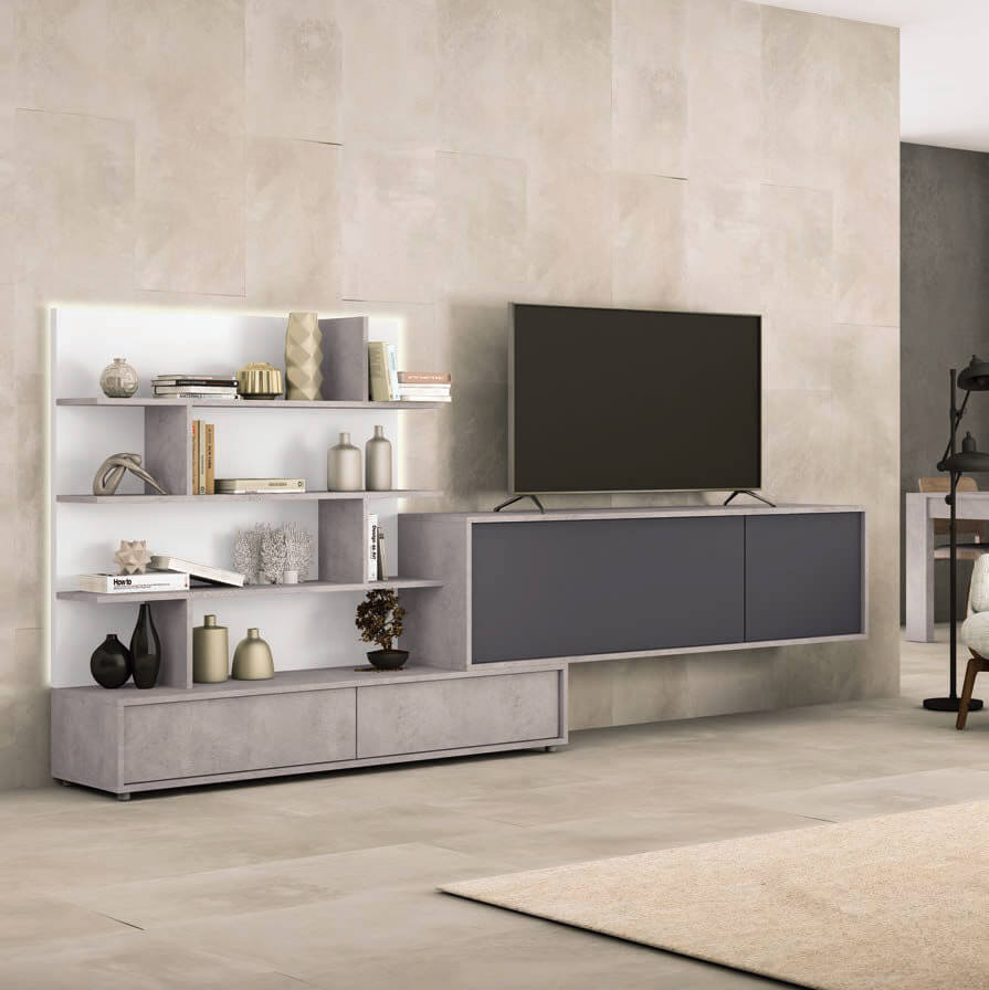 Compisición de salón moderna y elegante por el diseño que tiene y la combinación de colores. Además, tiene bastante espacio de almacenamiento.