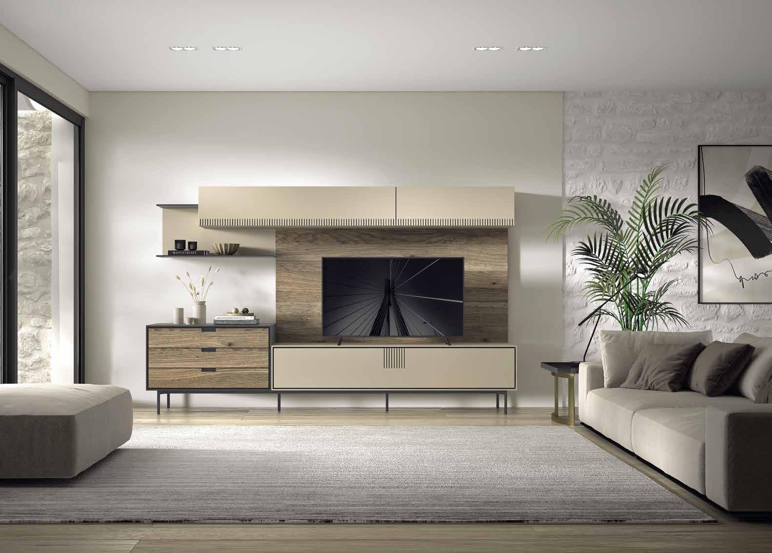 Con espacio para almacenaje, zona de TV y elementos decorativos, este mueble ofrece todo lo que necesitas en una sola pieza, adaptándose tanto a estilos modernos como más clásicos.