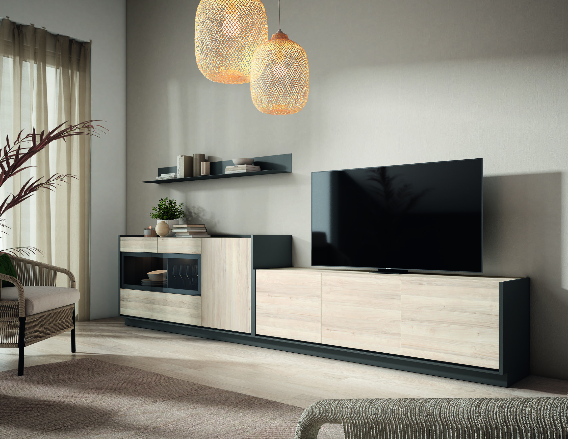 Este mueble de salón es la opción perfecta para quienes buscan una solución práctica y con diseño. Con una composición moderna y adaptable, podrás organizar tu zona de estar combinando módulos, estanterías, vitrinas y espacio para TV, según tus necesidades.