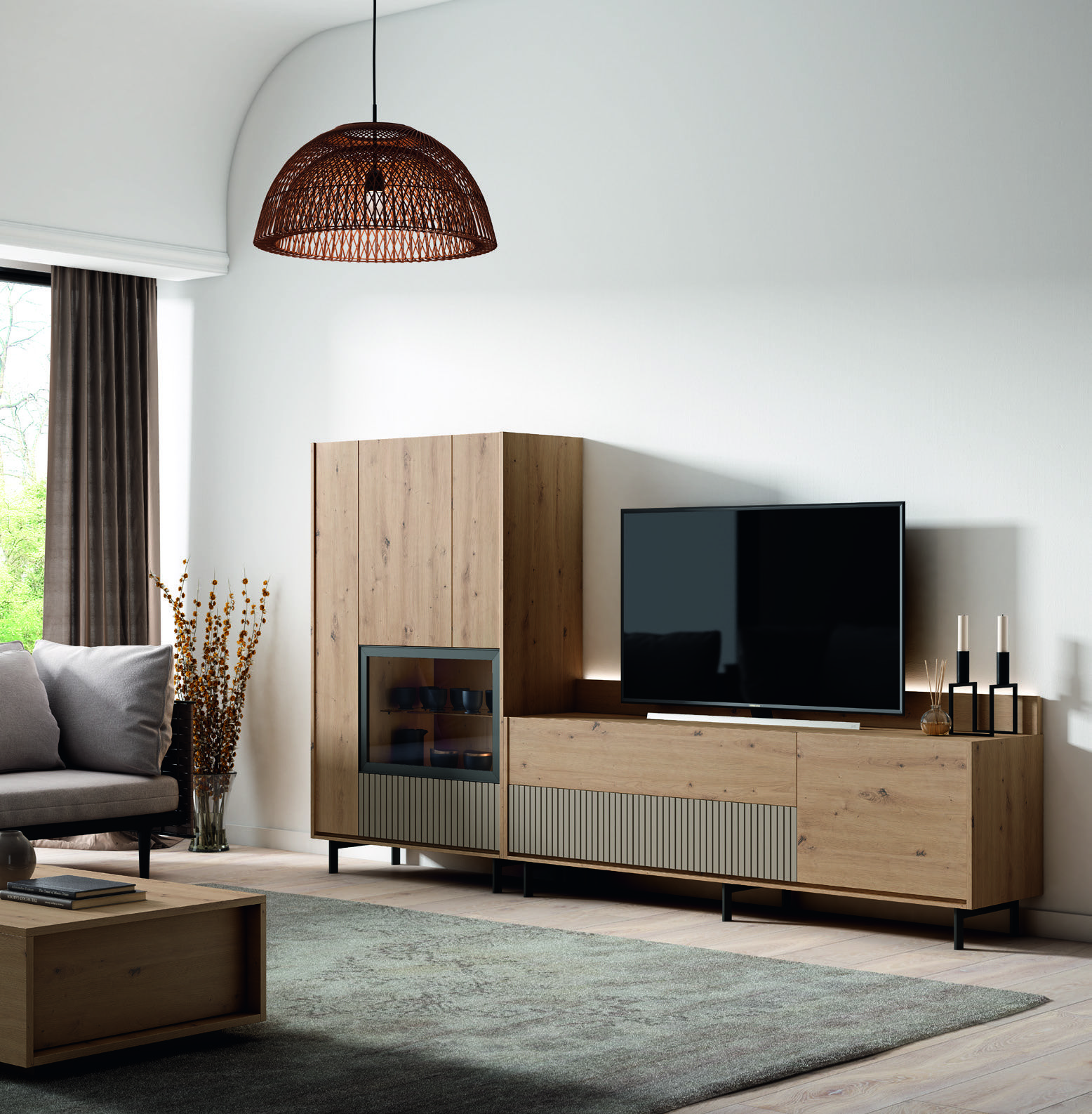 Crea un salón con estilo propio con nuestro mueble de salón personalizable, diseñado para adaptarse a cualquier espacio y necesidad. Con una combinación de diseño, funcionalidad y materiales de calidad, esta composición es ideal para integrar la zona de TV, almacenaje y decoración en un solo conjunto armonioso.