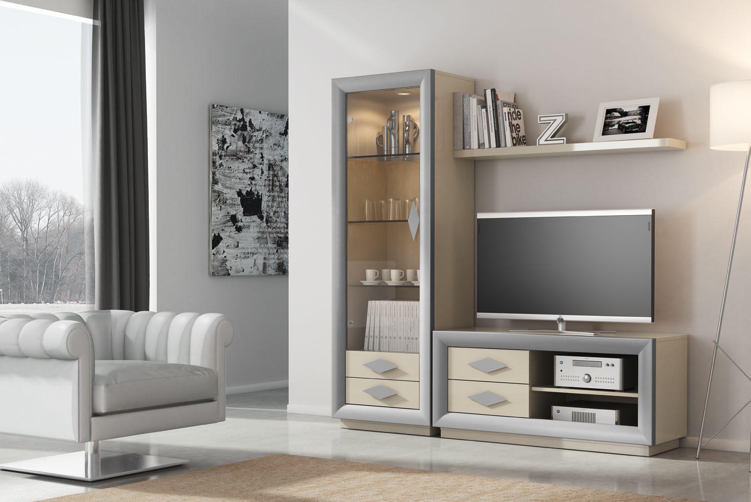 Mueble de salón completo con moldura rombo plata. Elegante y de diseño.