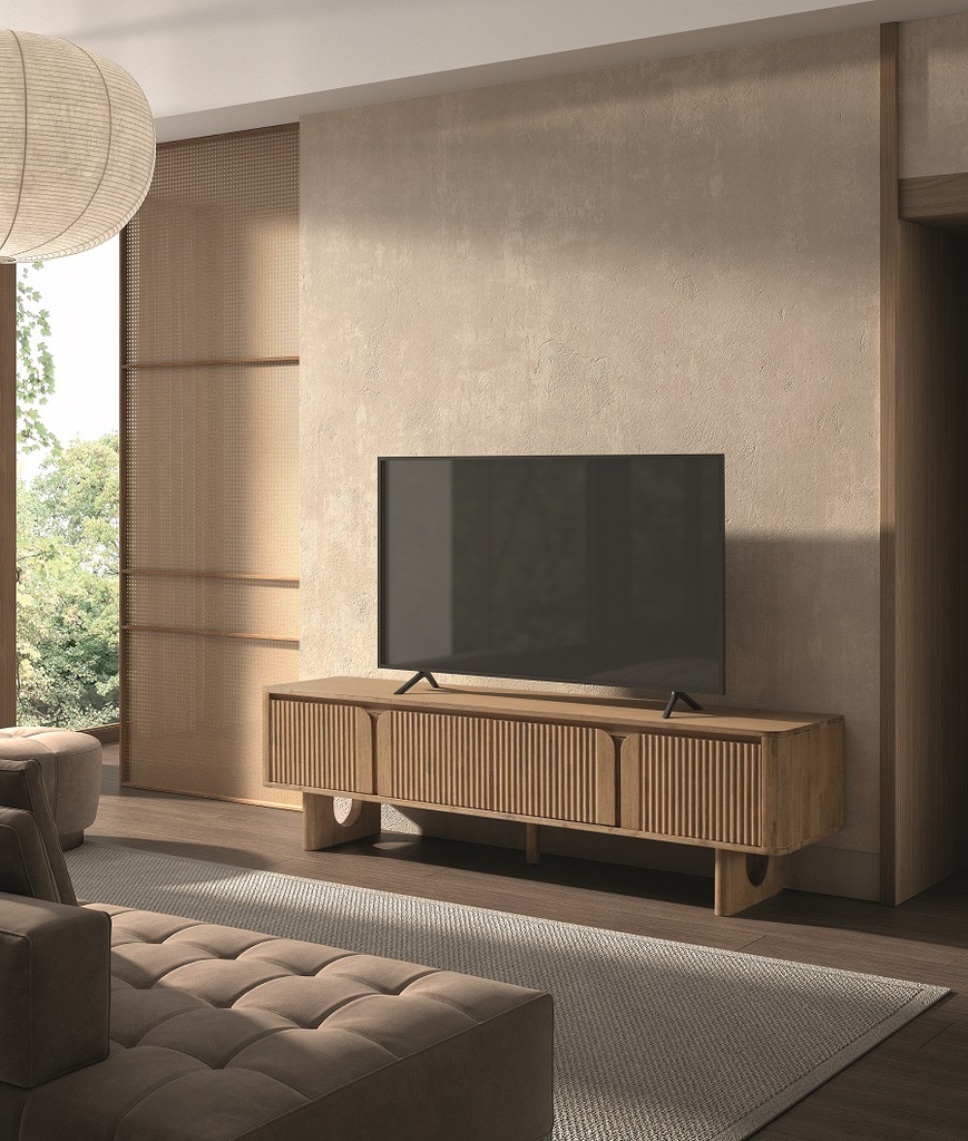 Gracias a la nobleza de la madera maciza, cada pieza es única, con vetas y tonalidades que le otorgan personalidad propia. El TV-502 no solo es un soporte funcional para tu televisor, sino también un elemento decorativo que realza el estilo natural y elegante de tu hogar.