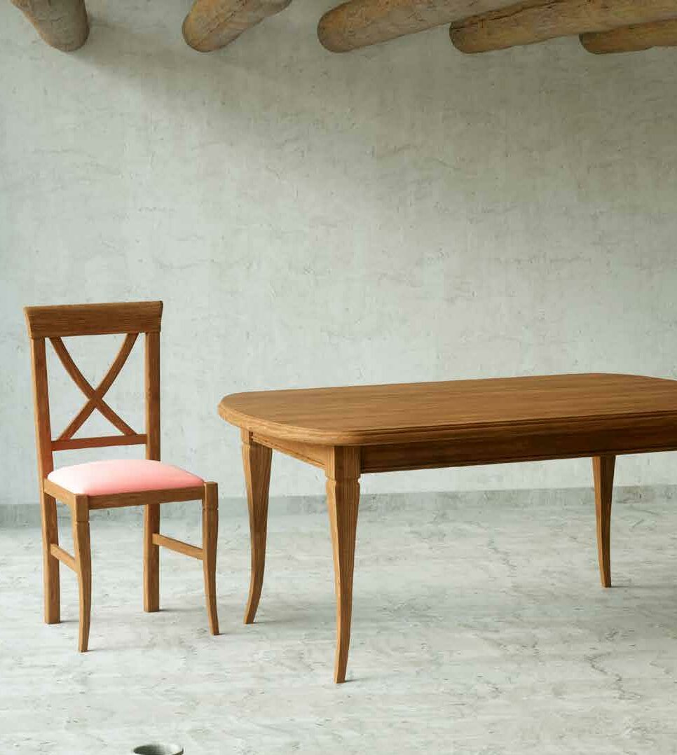 Silla de madera tradicional de comedor con detalle aspa y tapizada.