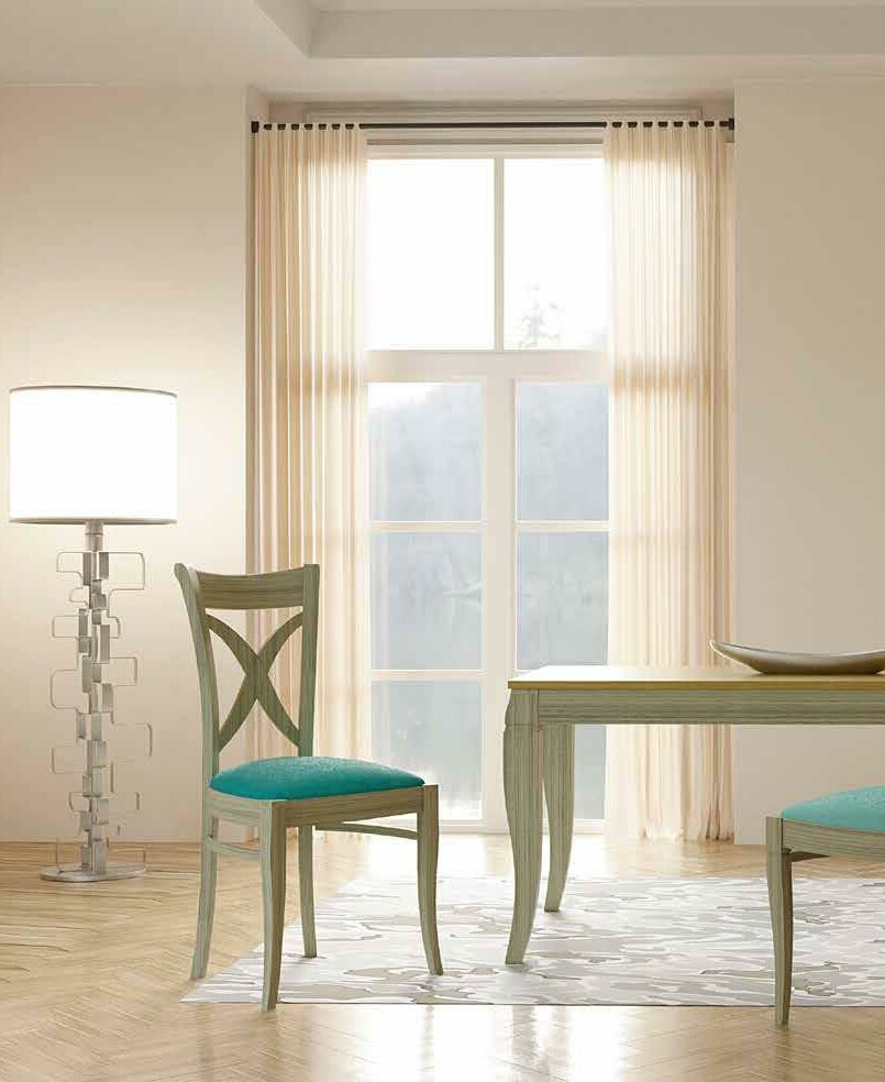 Silla de madera tradicional de comedor blanca con detalle y tapizada.