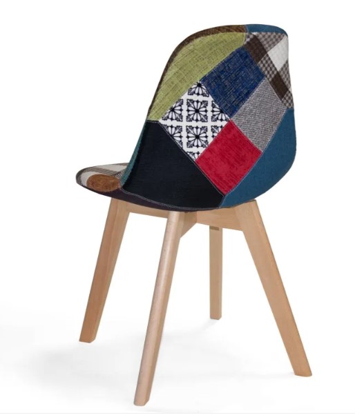 El asiento, fabricado en polipropileno de alta calidad, ofrece resistencia y comodidad, mientras que su acabado en patchwork aporta color y dinamismo a cualquier ambiente. Las patas de madera de haya con forma rectangular añaden estabilidad y un toque natural que equilibra perfectamente el conjunto.