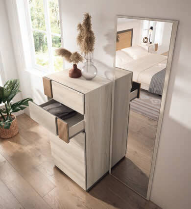 Sinfonier modelo DUO 6 cajones, aporta dinamismo a la composición gracias al juego de volúmenes de sus cajones. Perfecto para espacios pequeños e ideal para un dormitorio original.