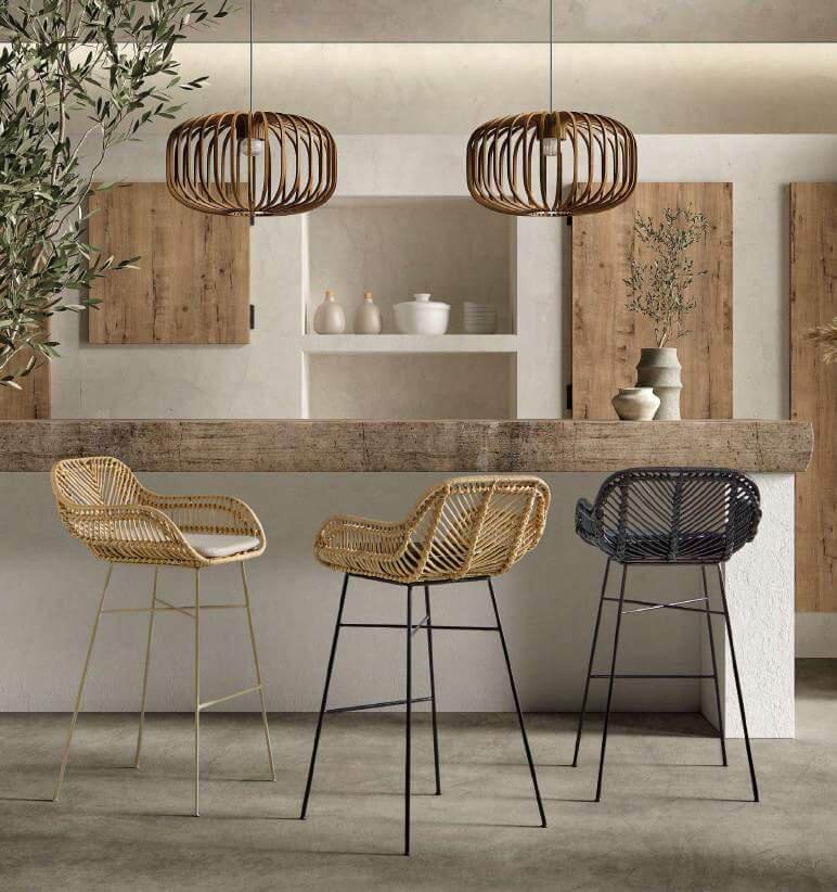 Taburete de ratán natural con la pata metálica beige o negra, también disponible con el ratán negro y la pata metálica negra.  Comodidad y elegancia en una sola pieza.